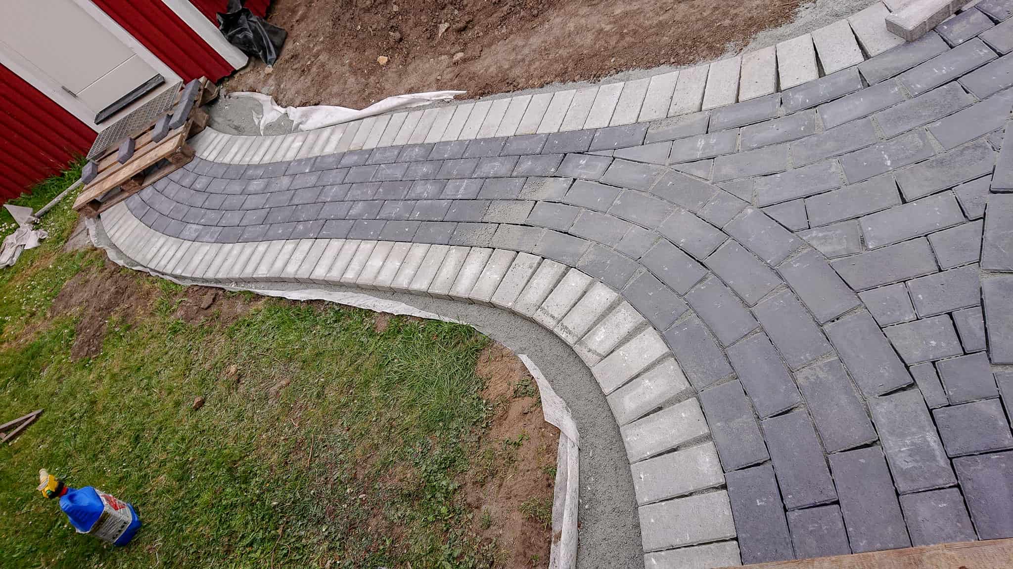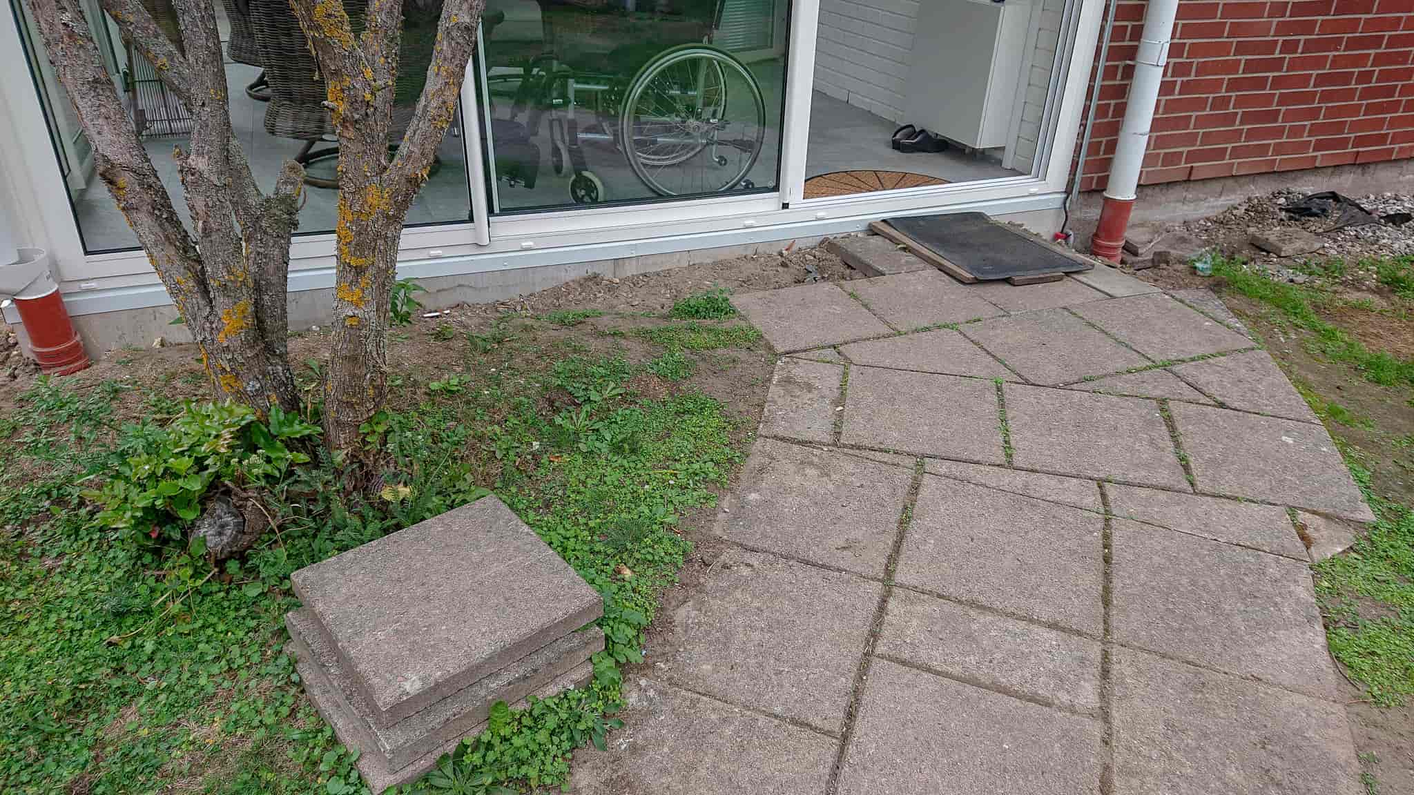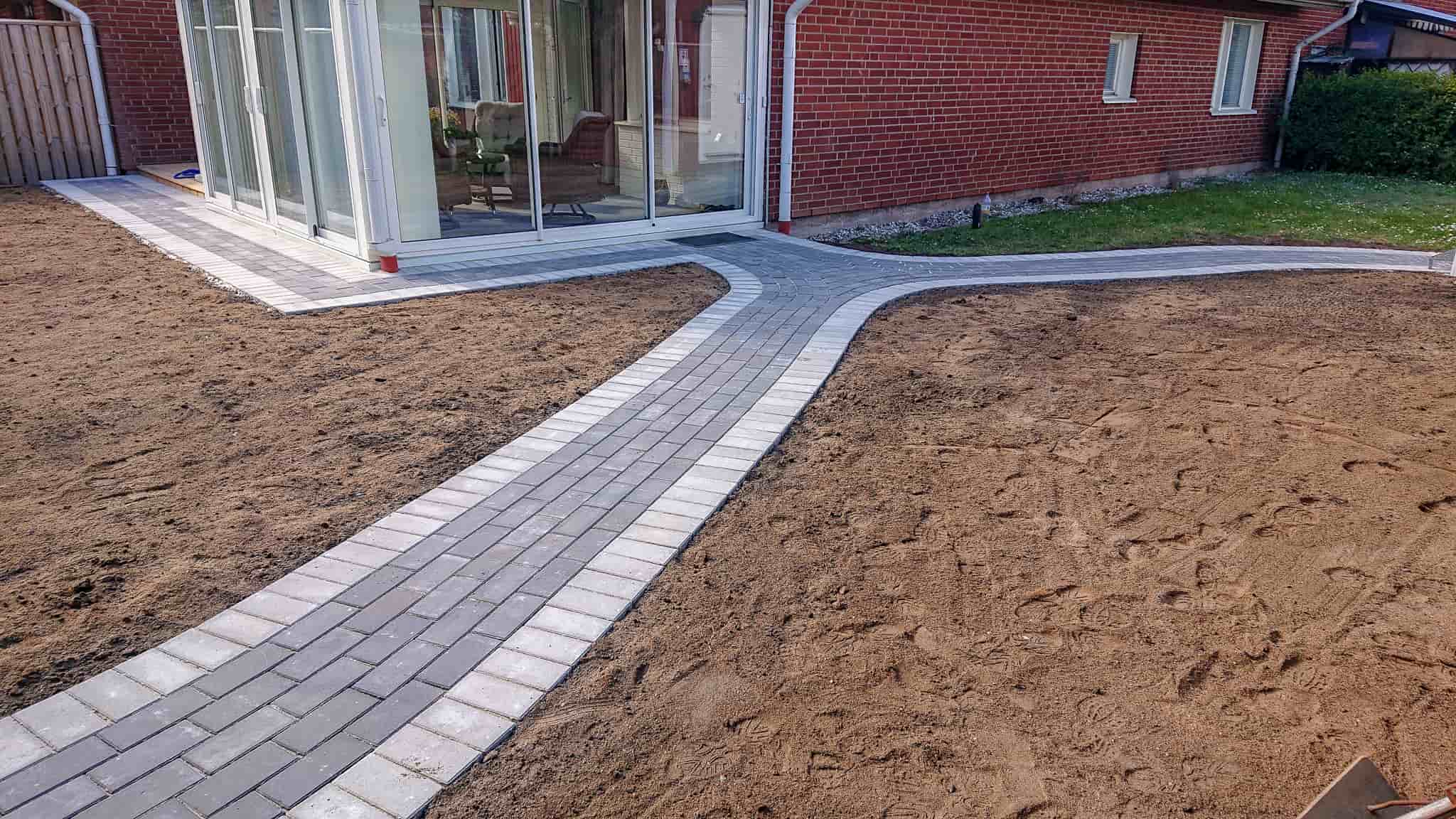 Uppfräschning av trädgården med ny trädgårdsgång, nya marksten runt utbyggnaden. Och ny färdig gräsmatta.