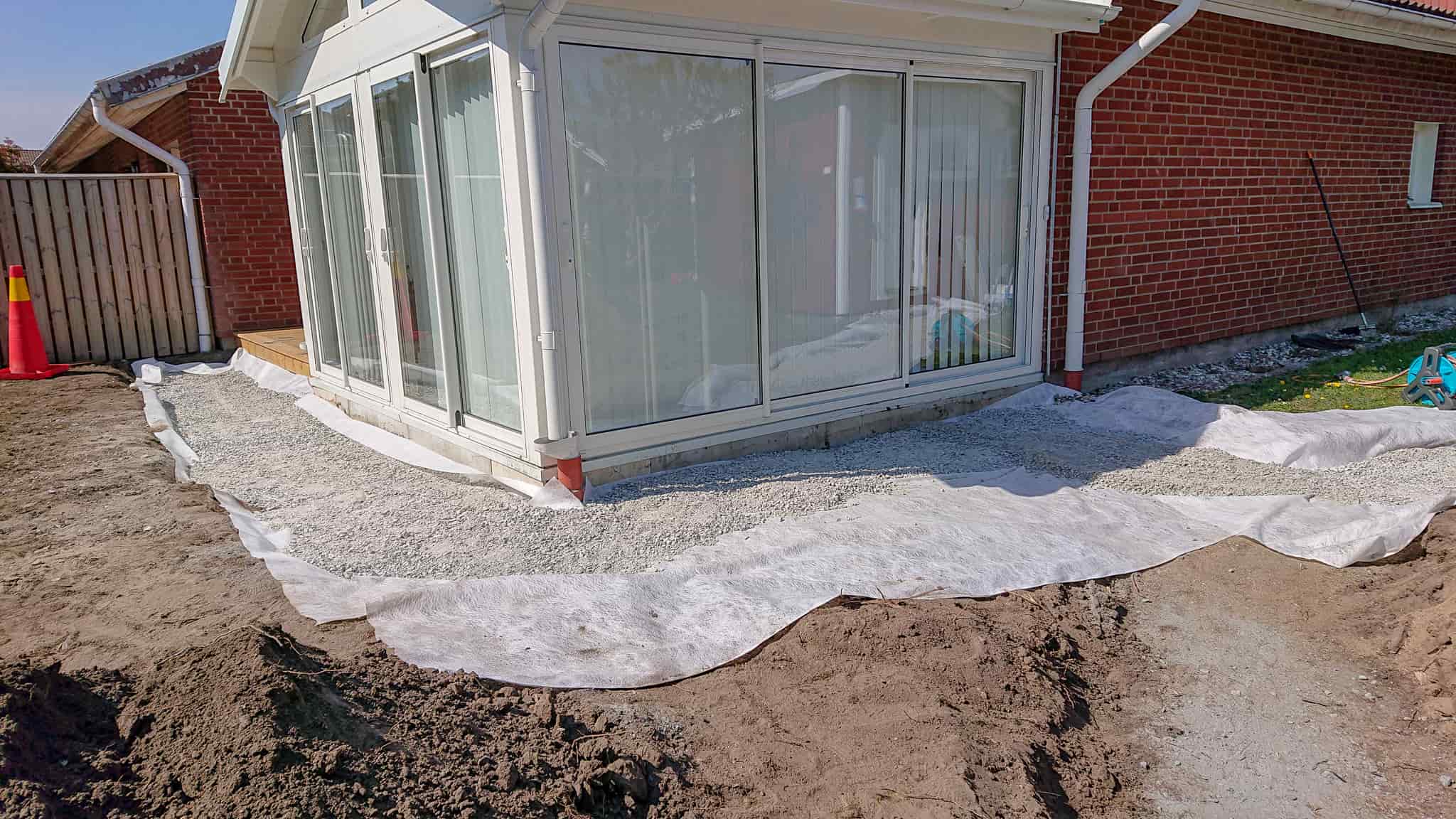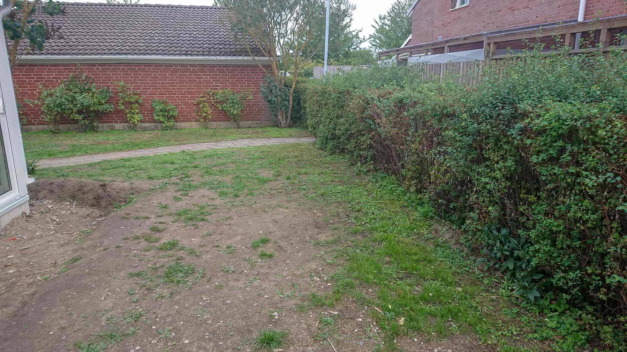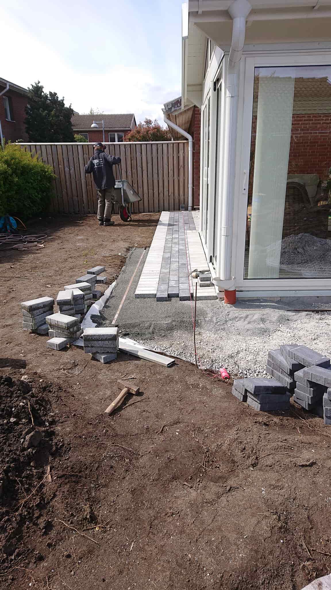 Uppfräschning av trädgården med ny trädgårdsgång, nya marksten runt utbyggnaden. Och ny färdig gräsmatta.