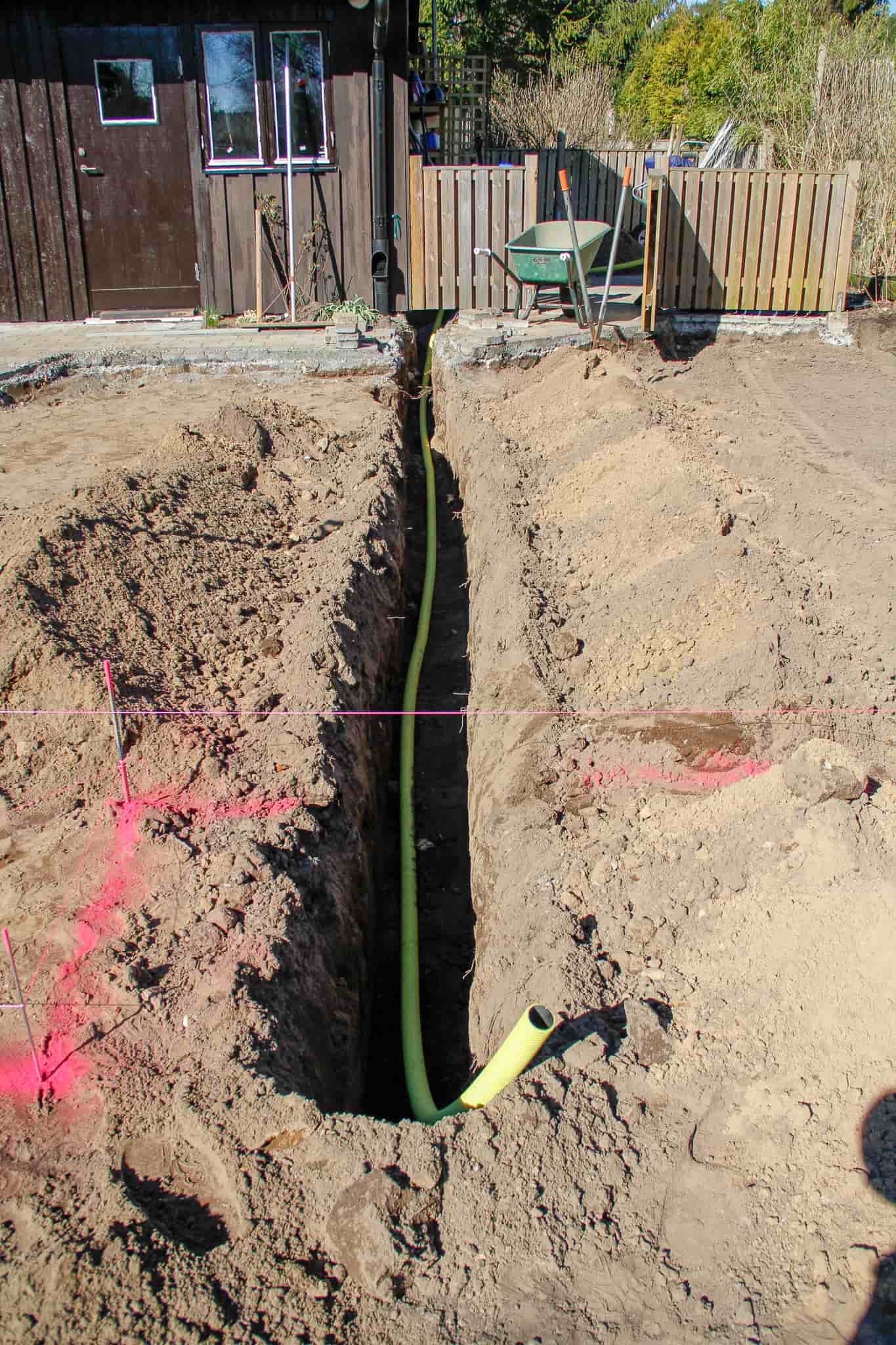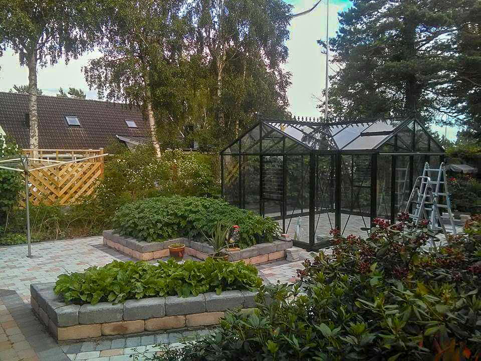 Montering och fastgjutning av växthus från Classicum. Indragning av el, samt förberedelse för vatten.
